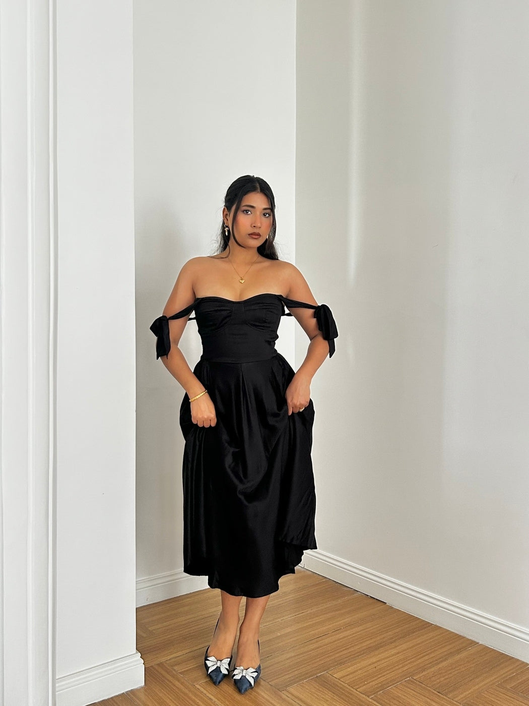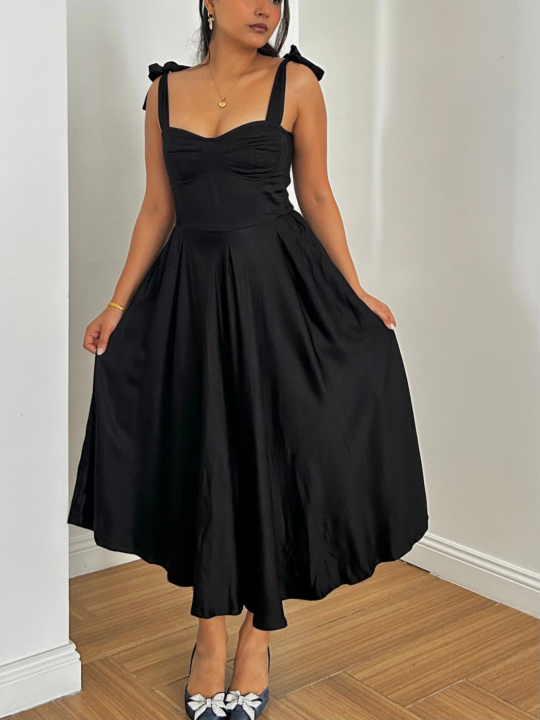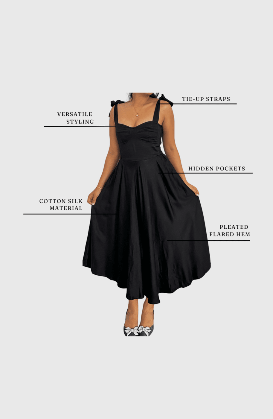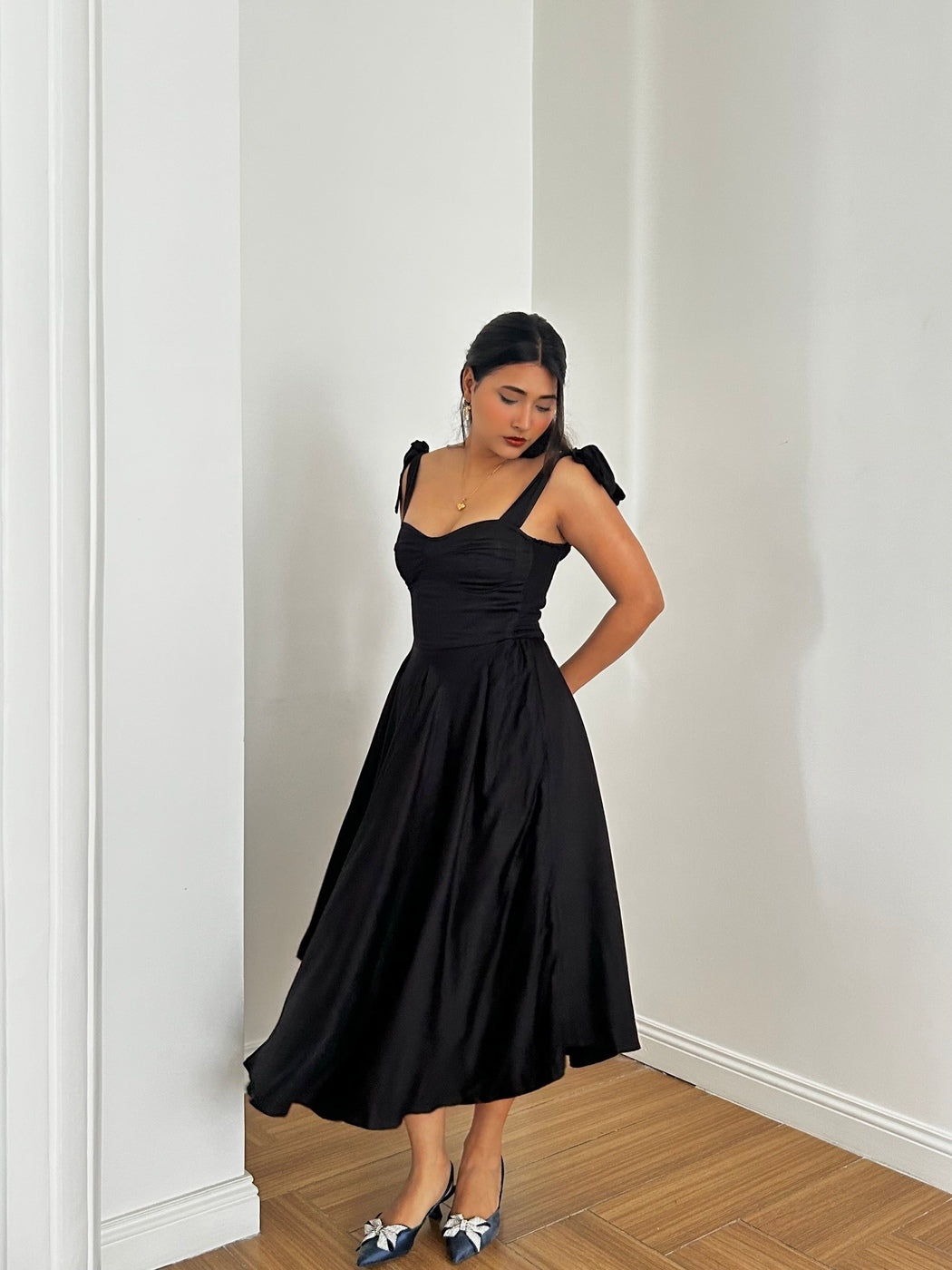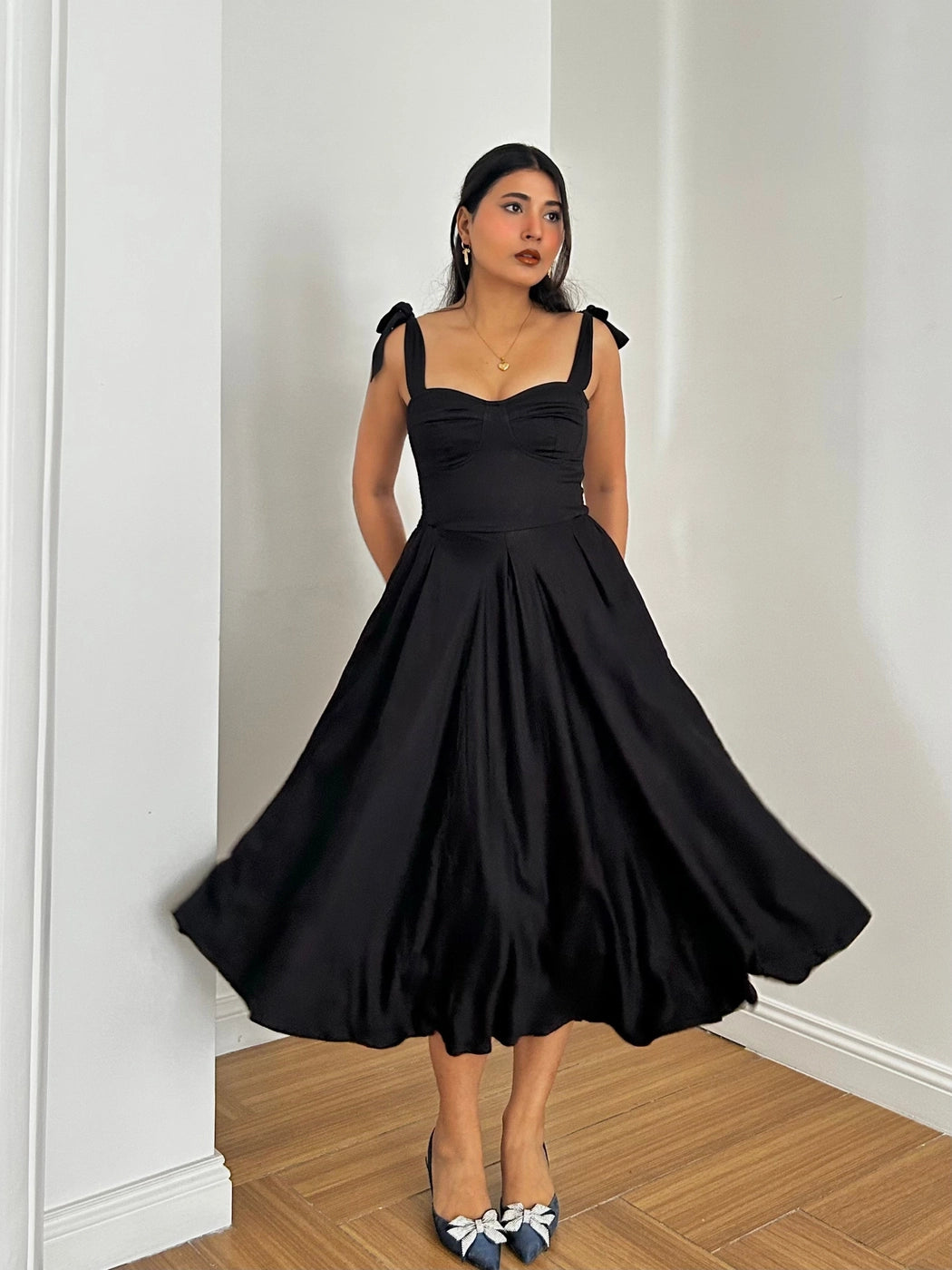 Our April Flare Dress is the perfect summer dress for women. This black midi dress features an A-line silhouette and charming tie-up sleeves. As a classic black dress, it's ideal for any occasion.
