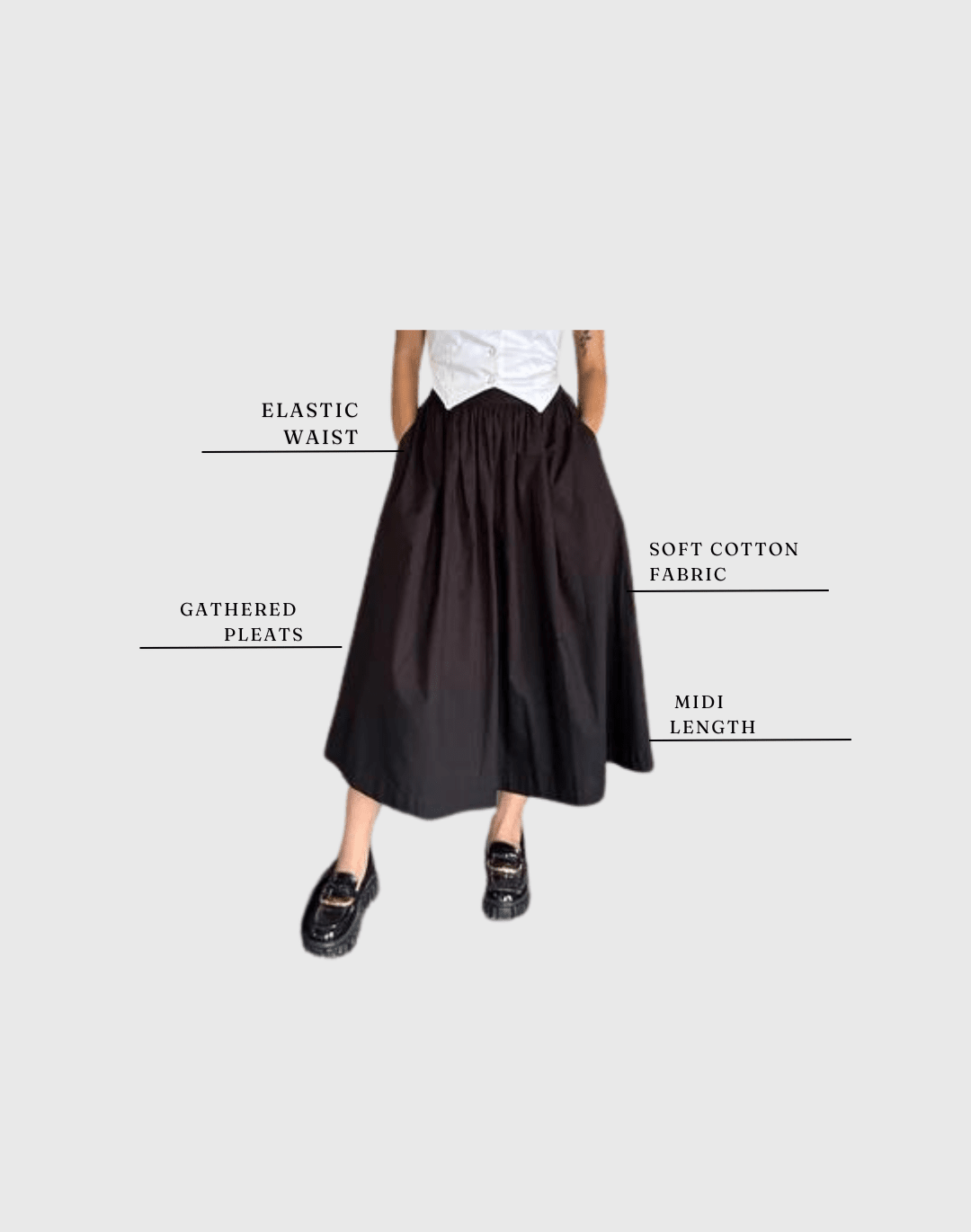 Our versatile Black midi skirt is a wardrobe essential. Featuring an elastic waist and soft gathered pleats, this black skirt offers both comfort and effortless style. The midi length makes it perfect for any occasion, from casual outings to formal events.