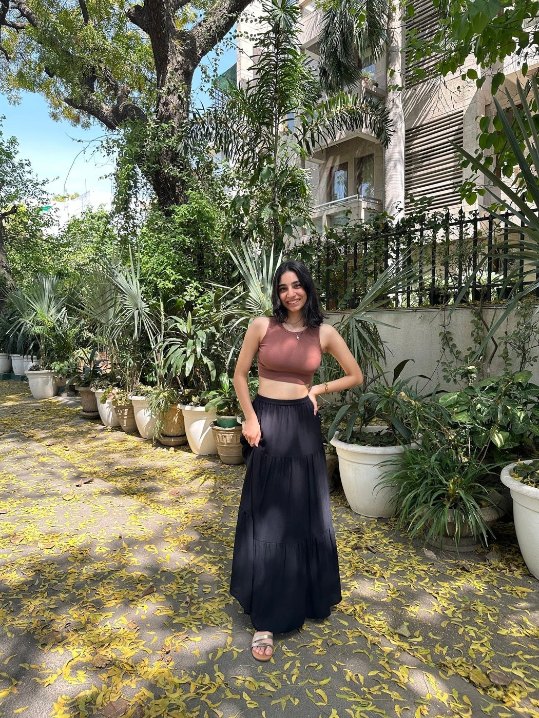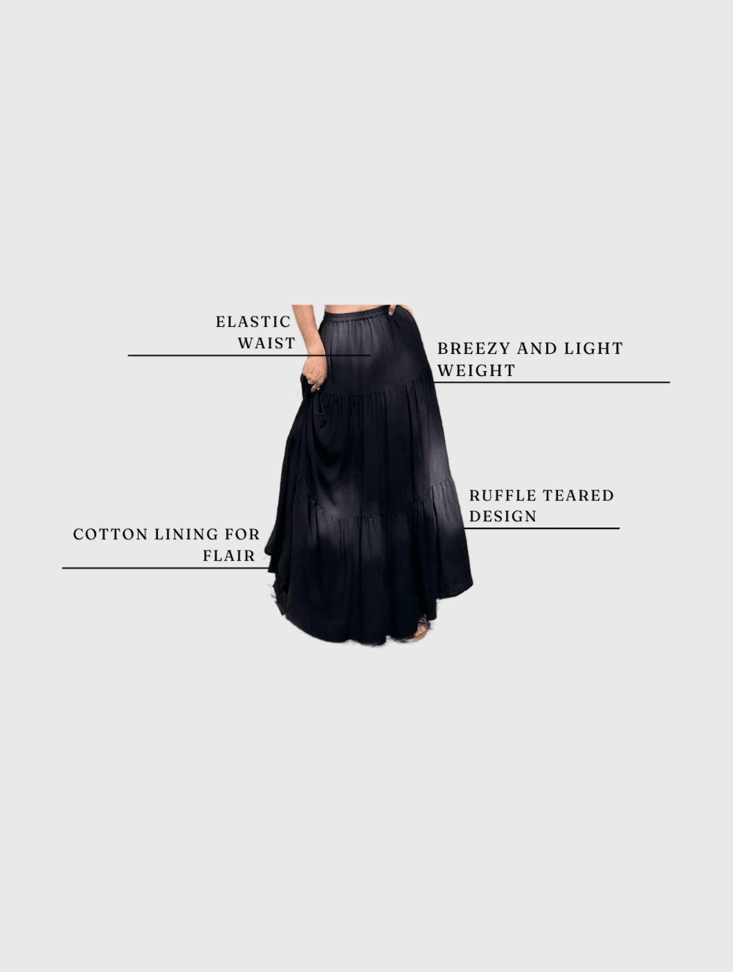 Stay cool and comfortable on your travels with our breathable Black maxi skirt. This flared skirt is ideal for warm vacation days or relaxed casual outings. The lightweight fabric ensures you stay comfortable all day long.
