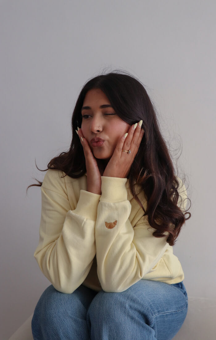 This loose fit hoodie features a croissant embroidery on the sleeve and “butter” embroidery on the hood.