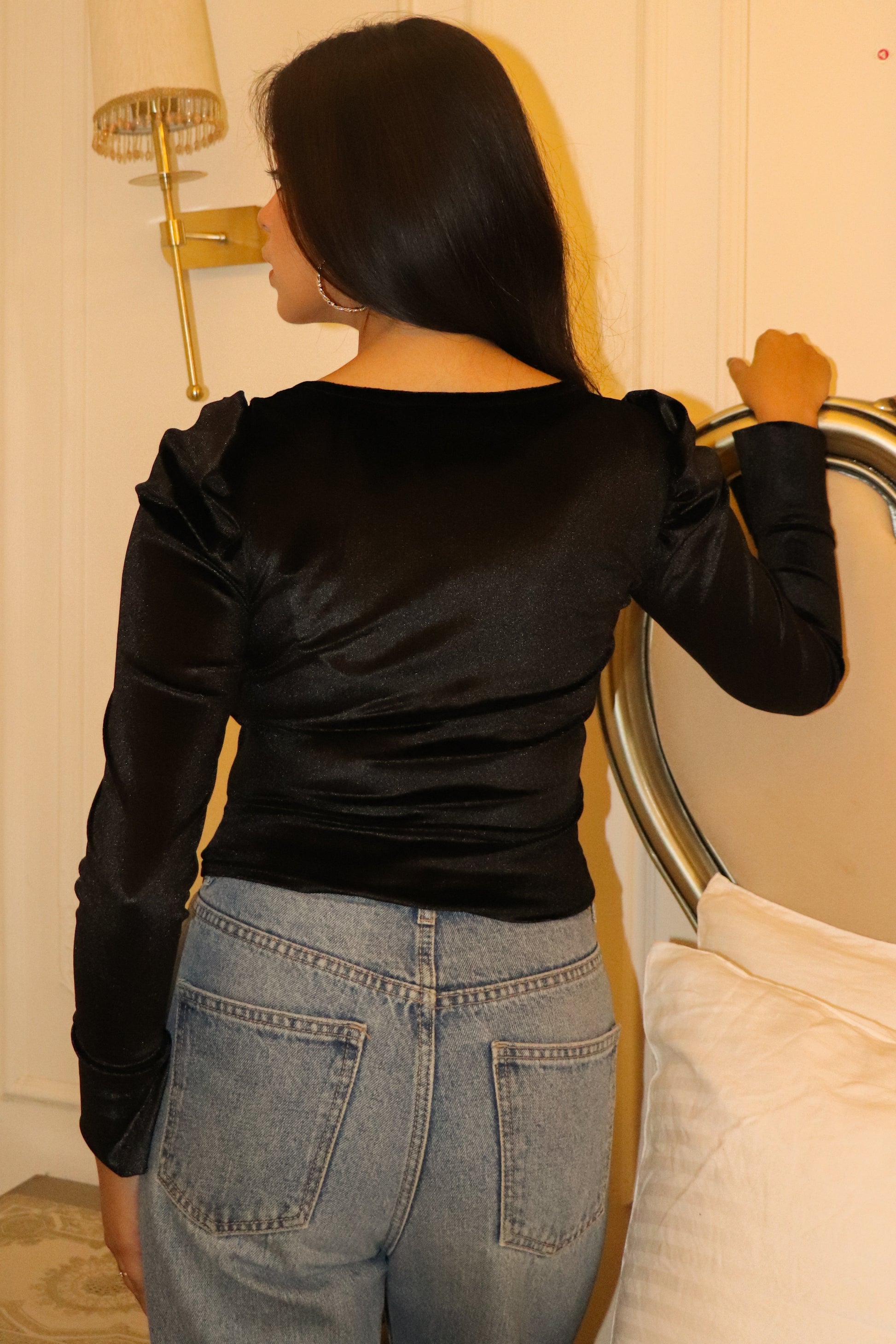 A black velvet top accented with a delicate white lace neckline. Plush, luxe, and effortlessly chic for special occasions.
