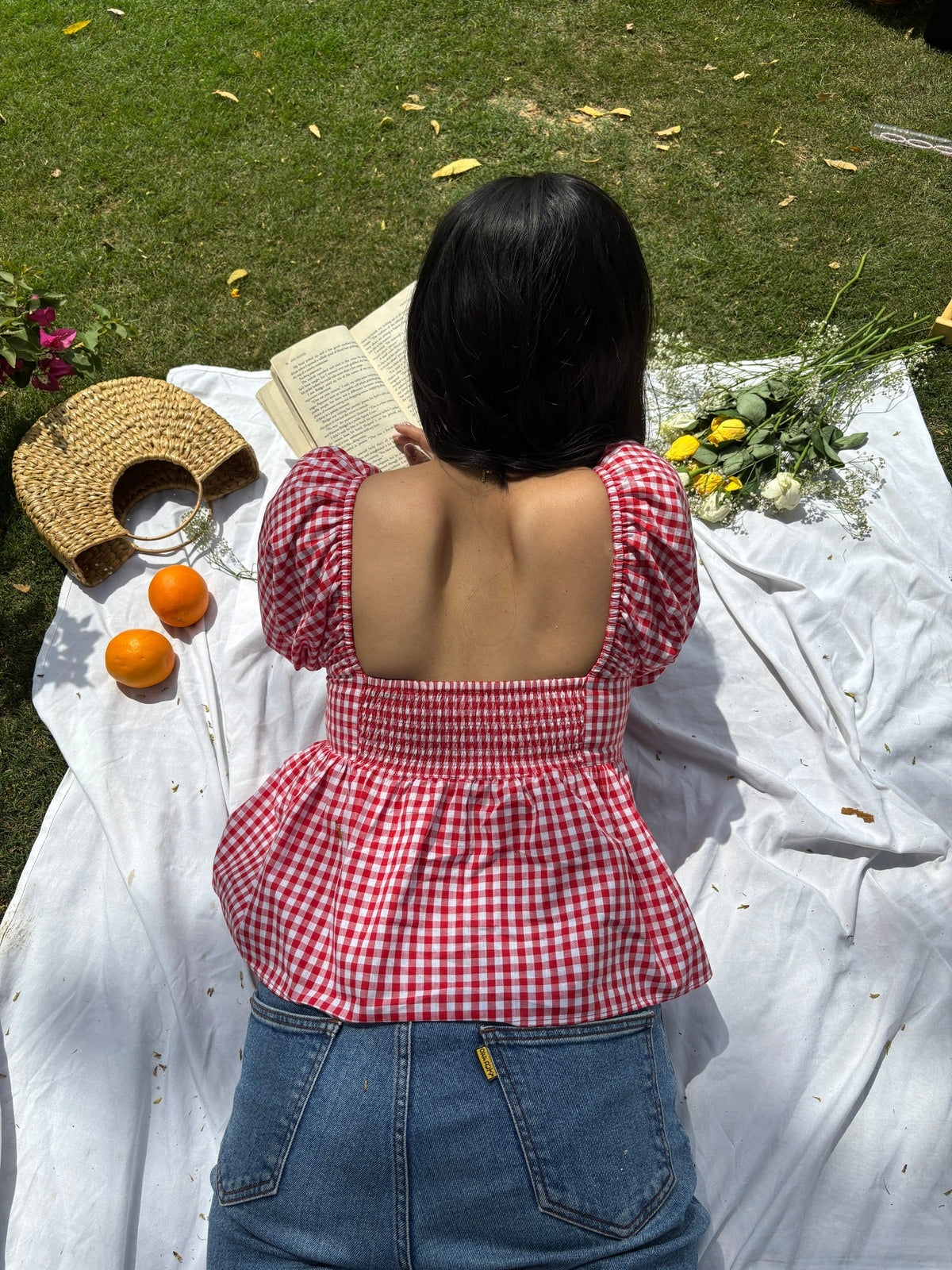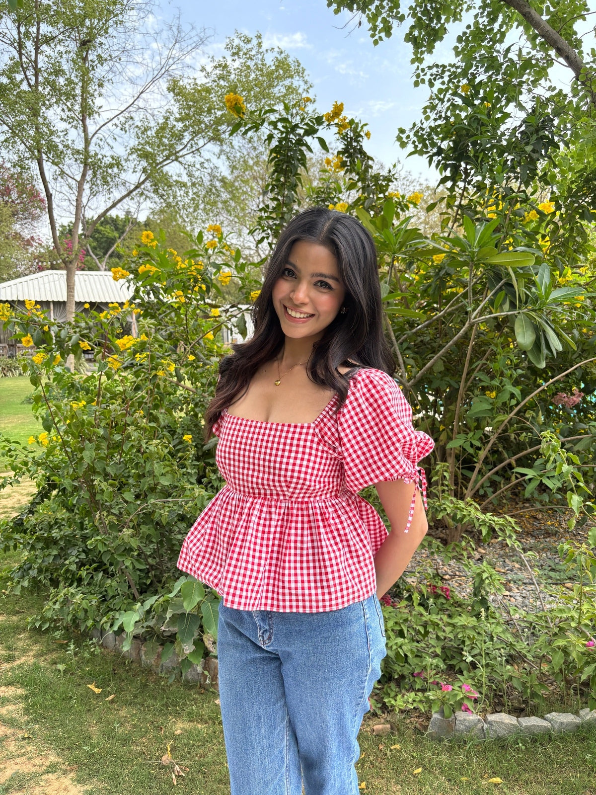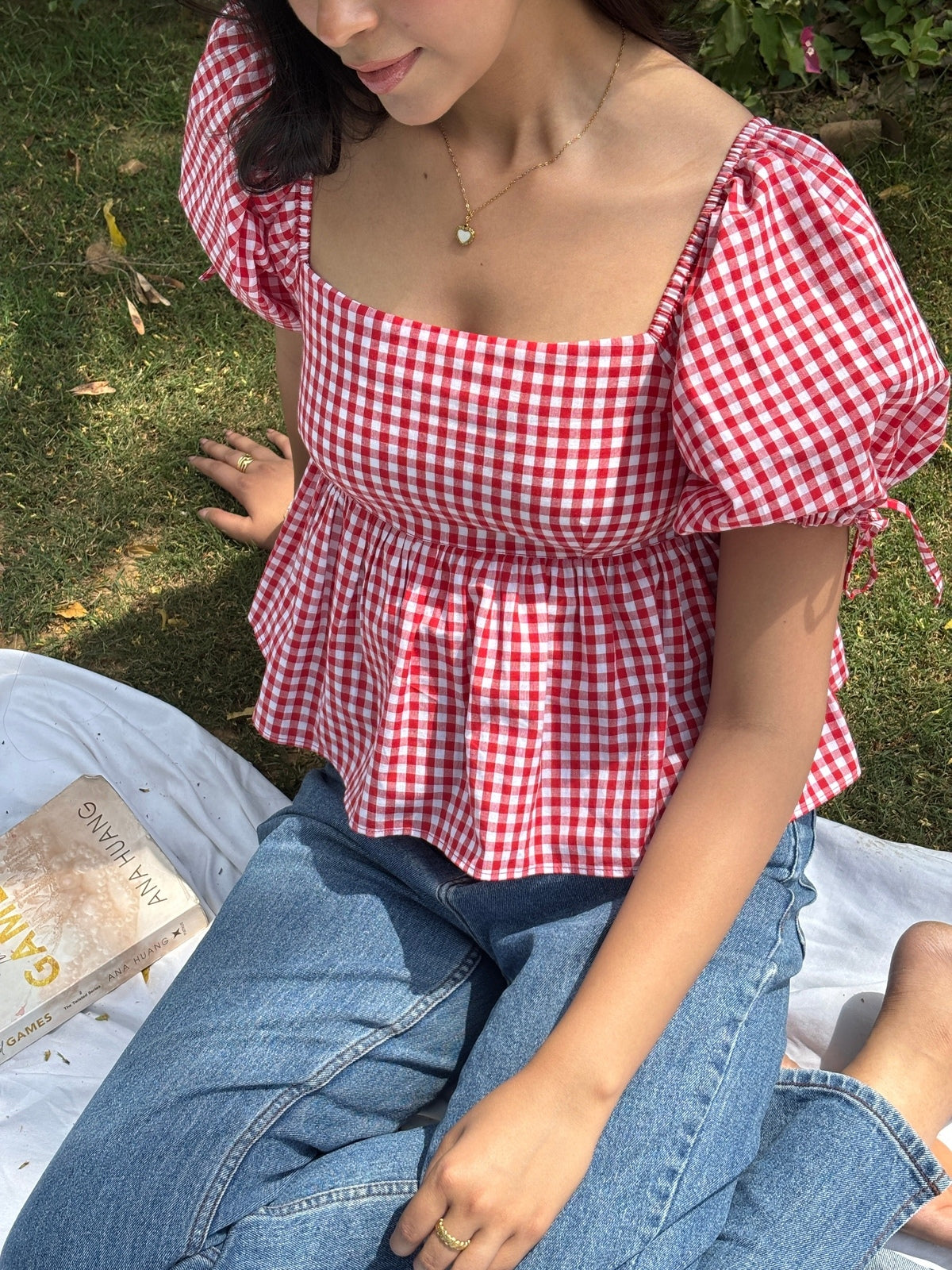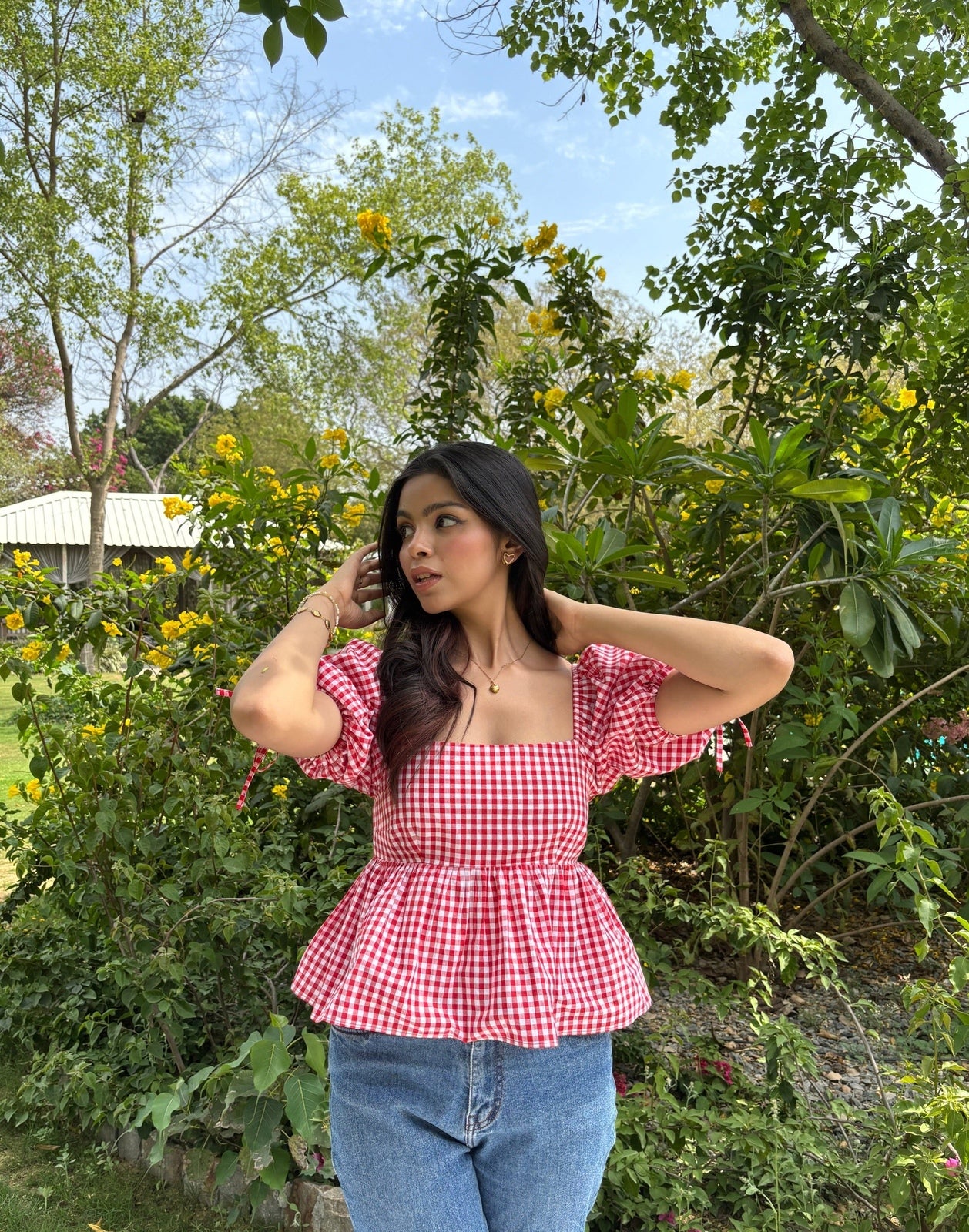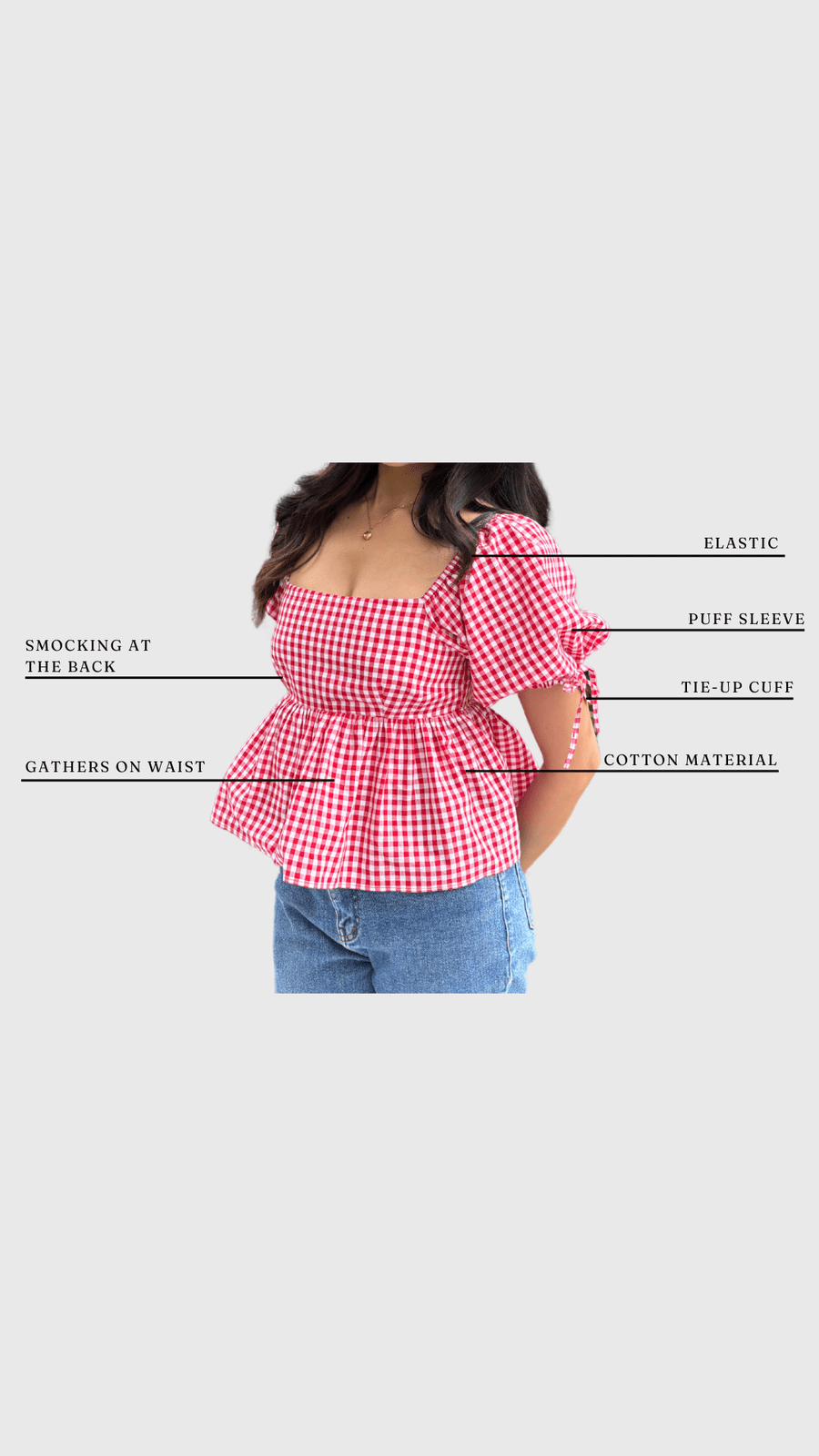 Strawberry Gingham Top - Summer Chic! Featuring a classic checkered print and flattering peplum waist. Perfect for brunch or picnic. Shop this summer casual essential in vibrant red gingham (plaid).