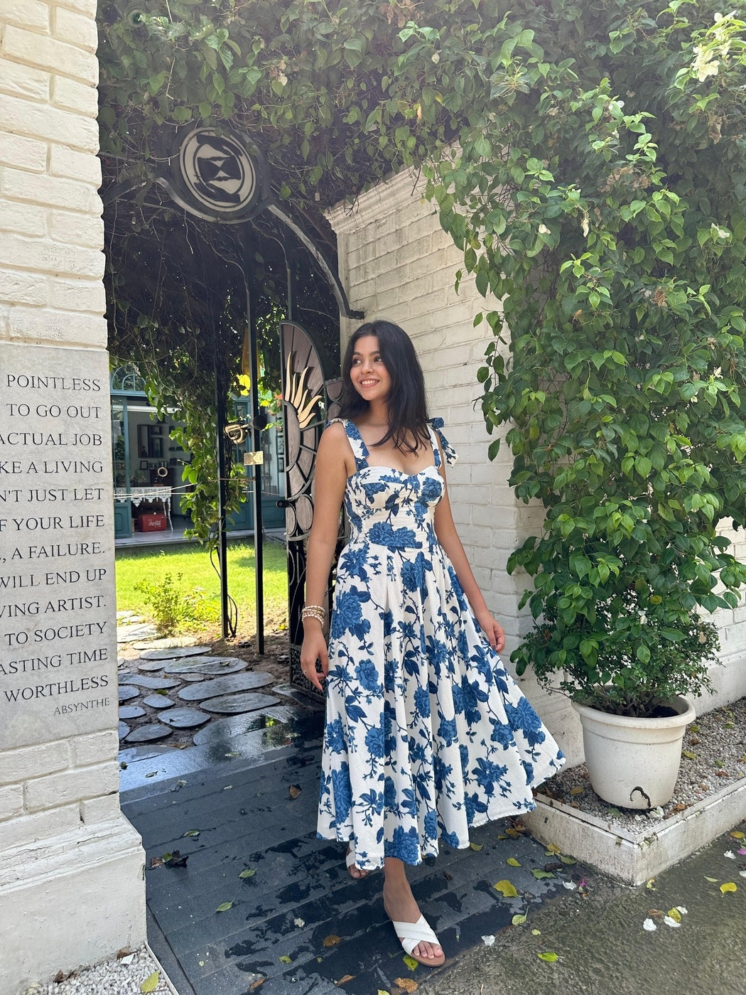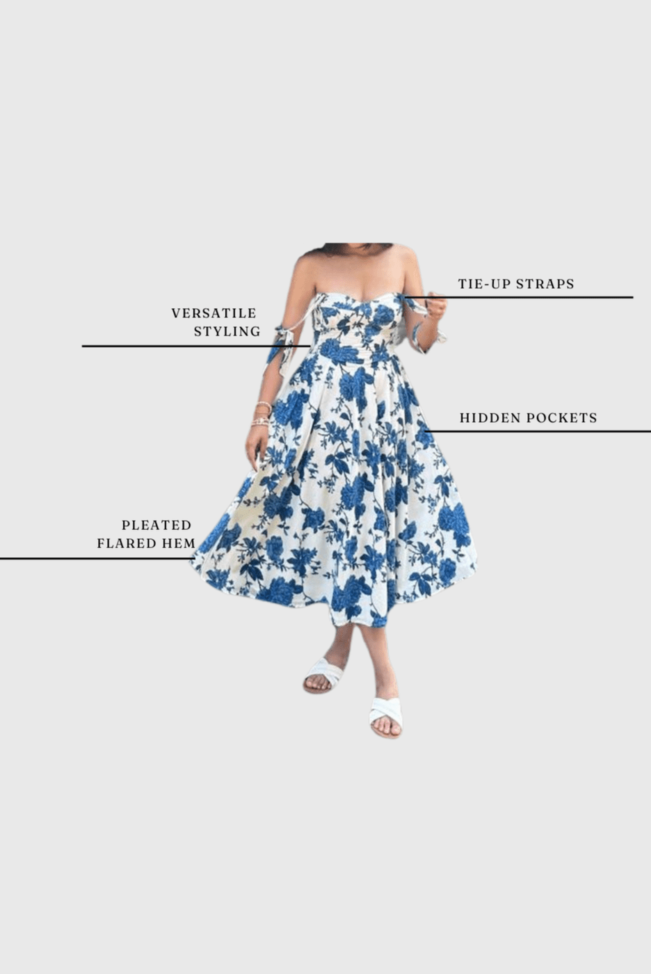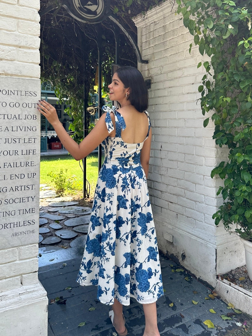 The Florence Tie Up Dress is a versatile addition to your summer wardrobe. This cute floral dress for summer features a Blue floral print, tie knot straps, and a comfortable flowy midi dress silhouette. It's perfect for a picnic day outfit or any casual occasion.