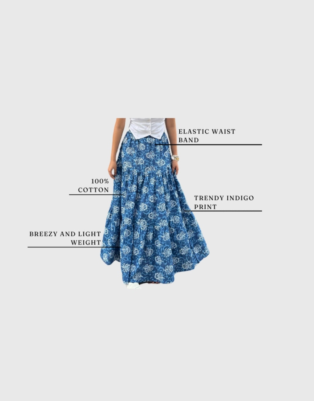 This 100% cotton skirt is the most versatile item your wardrobe can have. Be it a cafe date, a garden picnic or your perfect island vacation, this indigo skirt can be paired with anything and everything. Enjoy a snug fit with an elastic waistband along with a flared pattern.