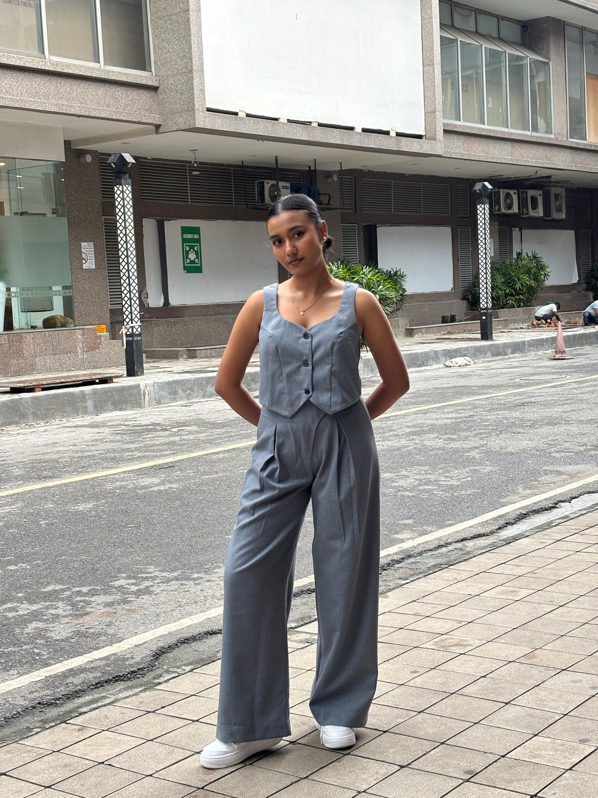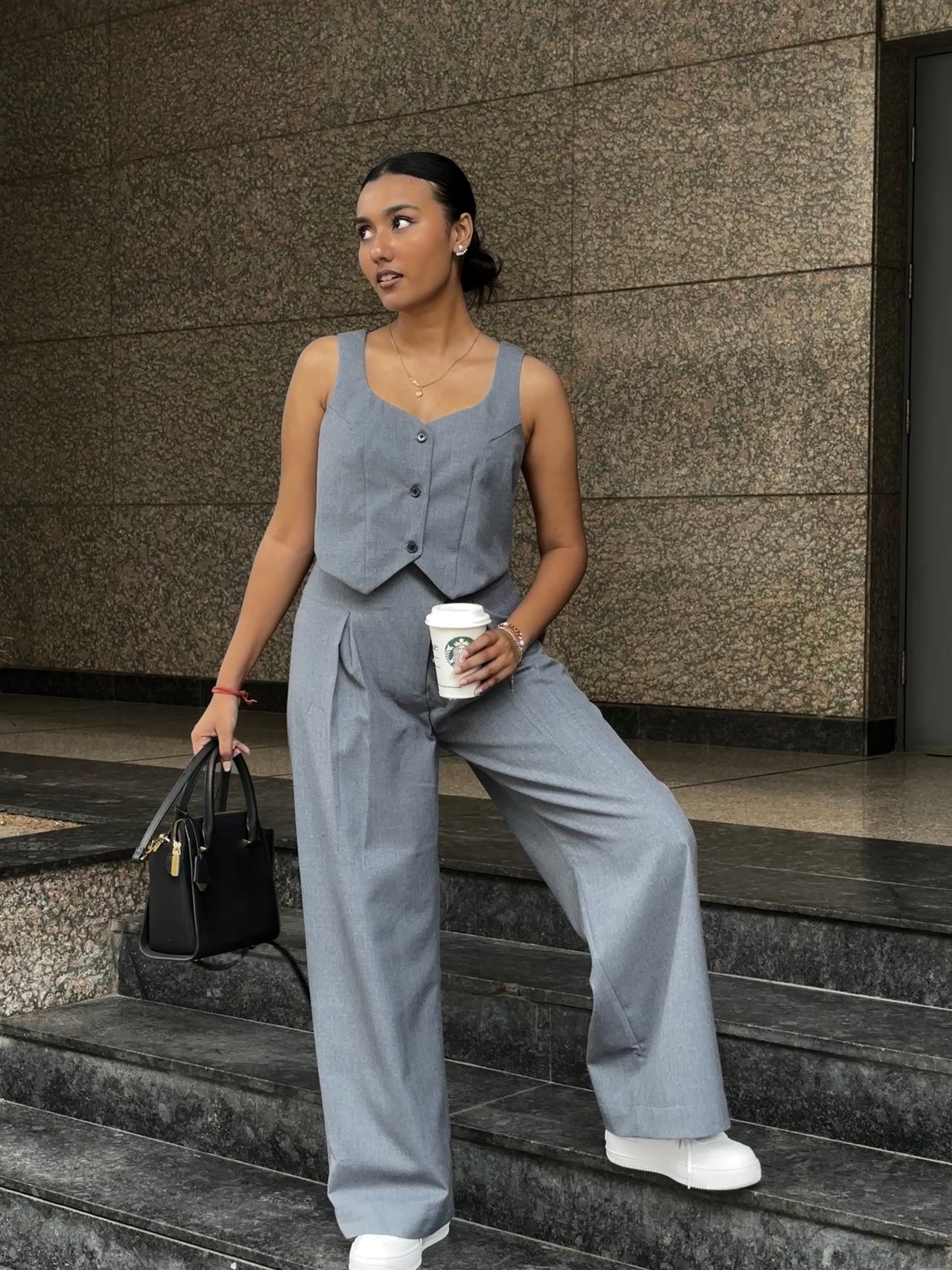 Our wide-leg pants are a versatile addition to your wardrobe, capturing the trend of the season. These grey pants, with their trendy design overlapping panel and denim look-alike fabric, are perfect for office wear or casual outings. Enjoy the look of denim pants with a sophisticated twist.