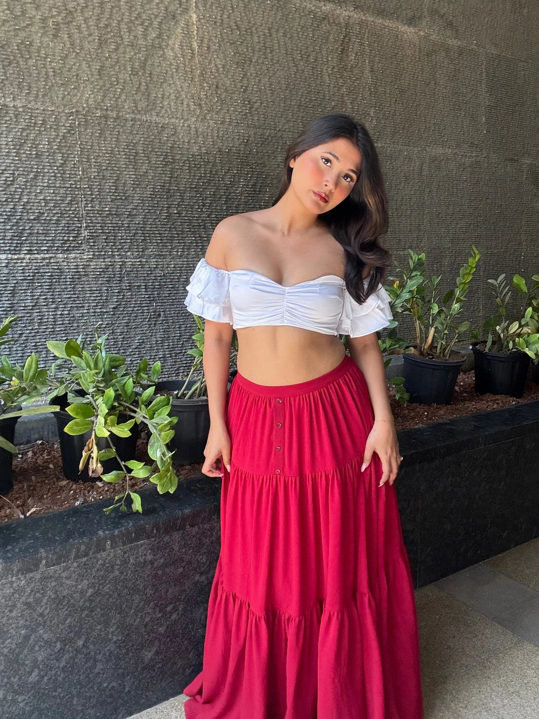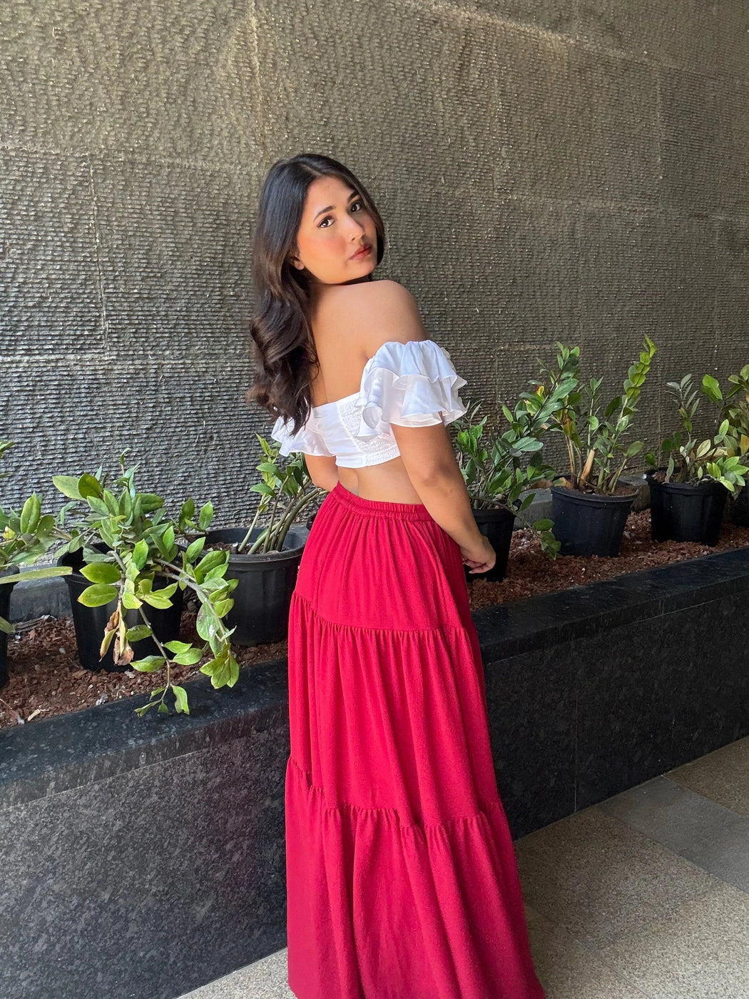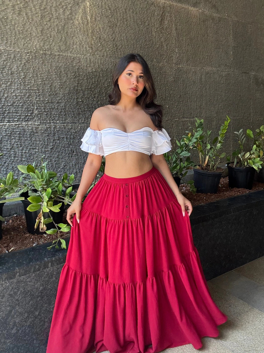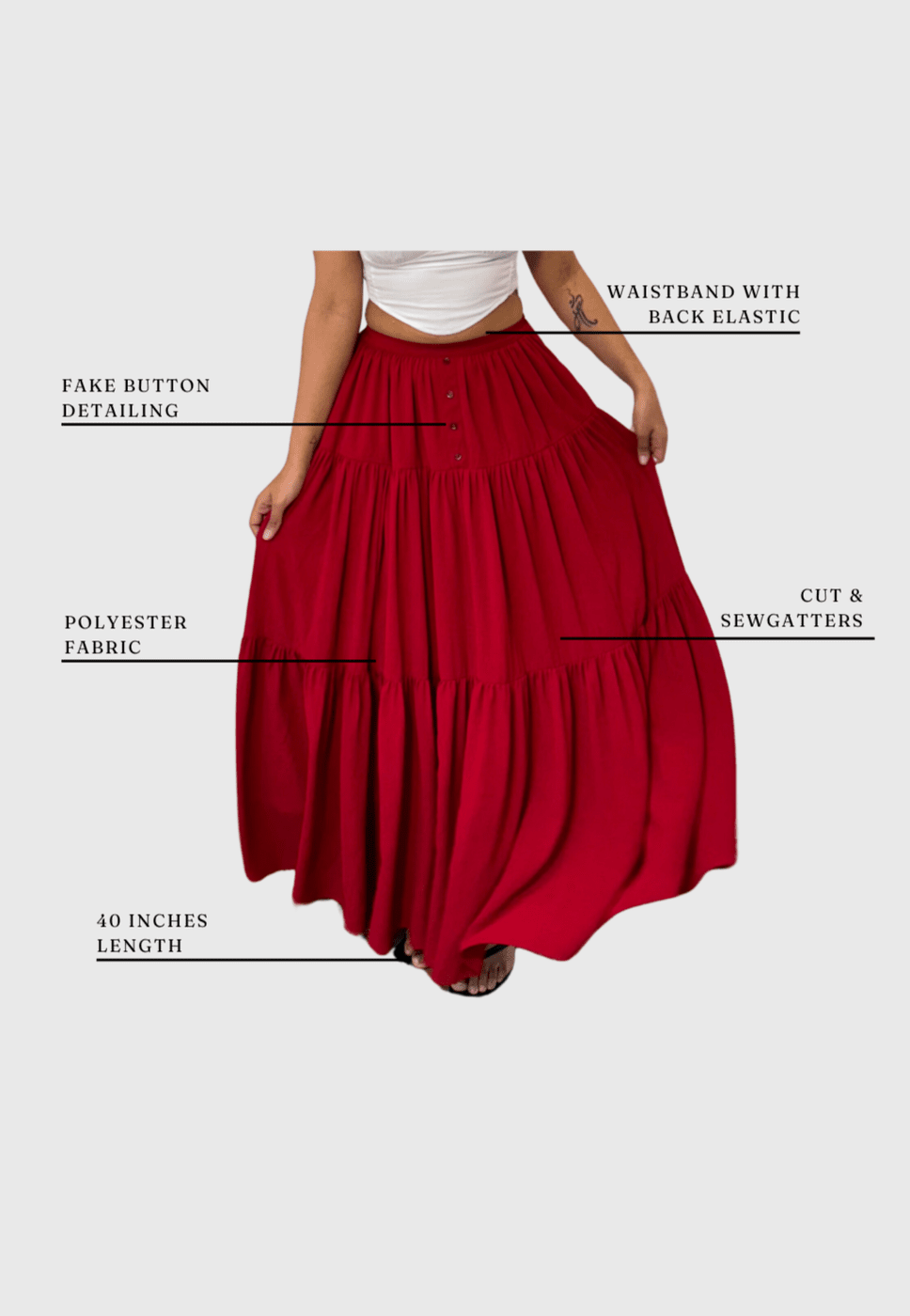 The Laila Maxi Skirt is a delightful addition to your summer wardrobe. The flared and gathered silhouette creates a beautiful summer flared skirt effect. This red maxi skirt is an essential long skirt for women and a lovely vacation outfit.