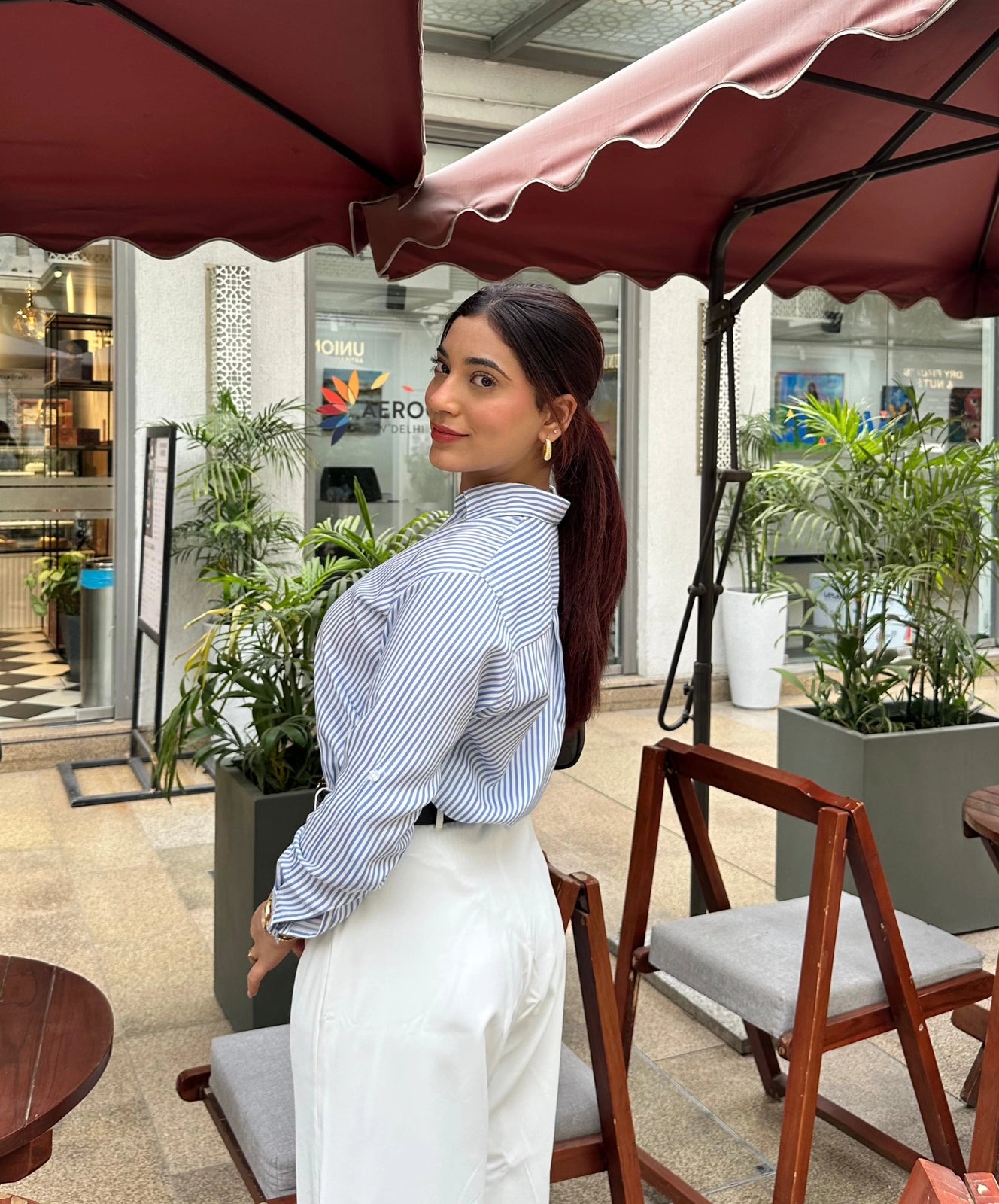 Blue and white striped shirt for women. The Madison Stripe Shirt is a collared shirt with long sleeves. A chic and smart choice with a trendy pattern, suitable as a formal shirt.