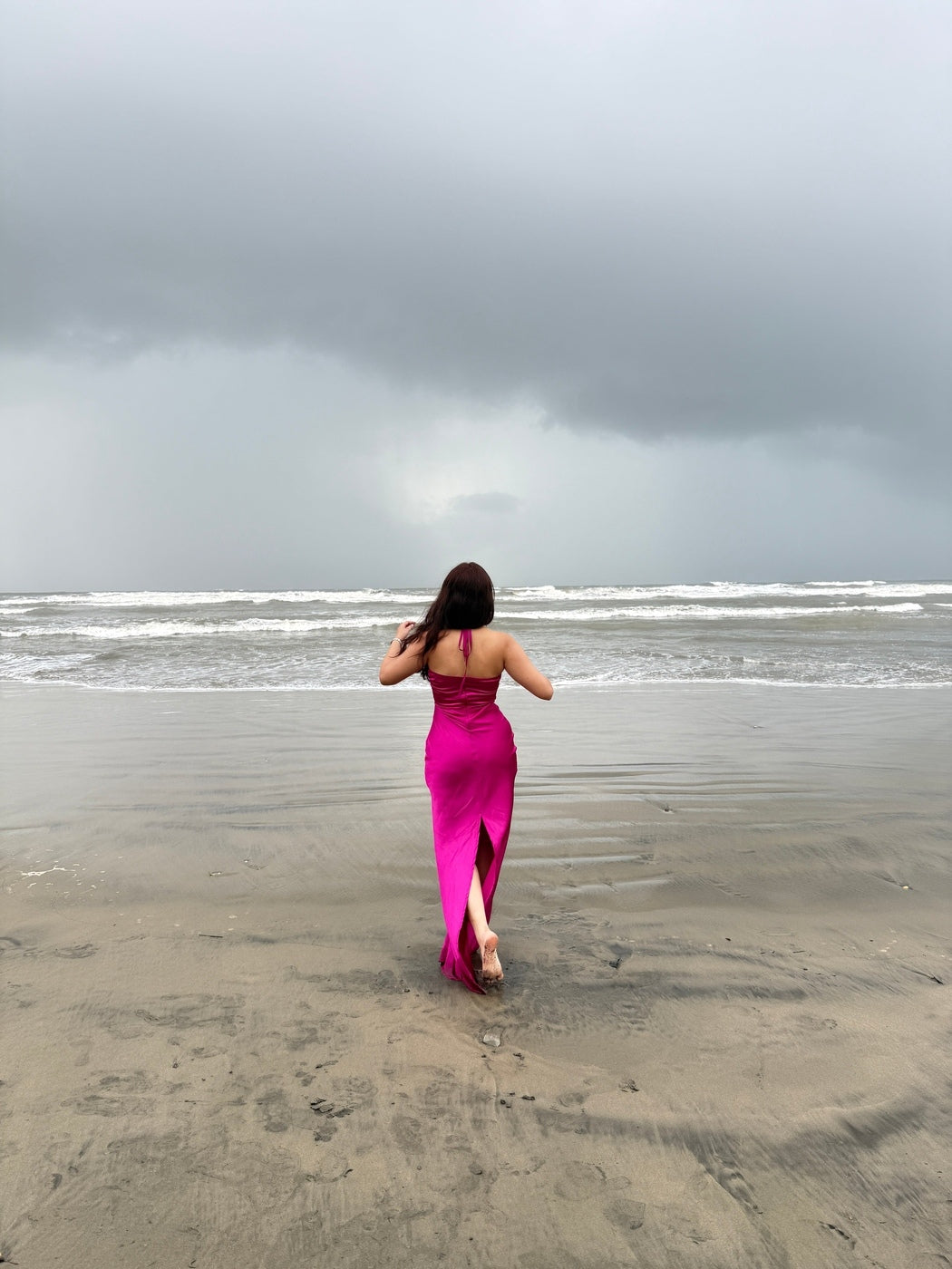 With its pop of fuchsia, soft satin shine, and cutout detail, this dress is equal parts fierce and feminine. Flowing yet fitted, it’s the dress that makes an entrance.